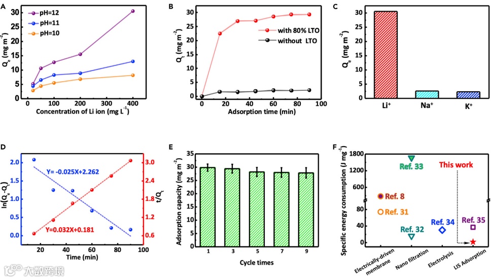 CAN在碱性含Li+溶液中的提锂特性。基于离子置换吸附法,CAN经酸化后,疏水层Li4T5O12晶格中的Li+被H+置换取代;与碱性含锂溶液接触时,贫锂状态的CAN与Li+接触发生离子置换完成Li+吸附。结果显示,CAN对Li+溶液(pH=12,CLi+ = 400 mg L-1)的吸附容量可以达到~30.5 mg m-2,此外,CAN在多次循环的过程中表现出良好的稳定性。与其他提锂技术相比,提锂能耗比仅为~1.63 J mg-1,CAN在吸附法提锂领域具有很高的成本效益。