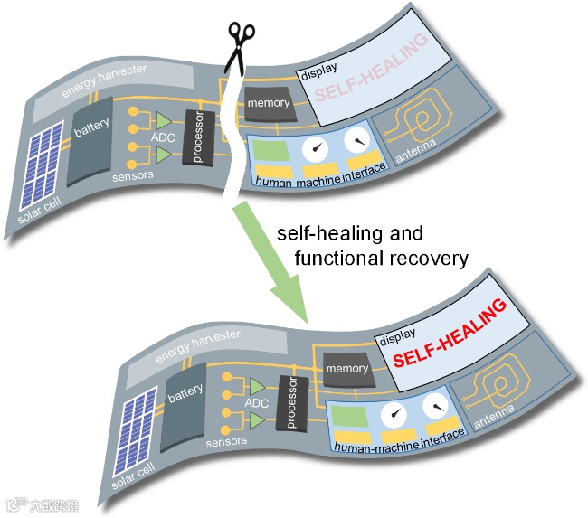 图1 可完全自修复的柔性电子系统:由多种基于自修复聚合物的电子元器件组成,包括太阳能电池板、蓄电池、能量收集装置、传感器、显示器等