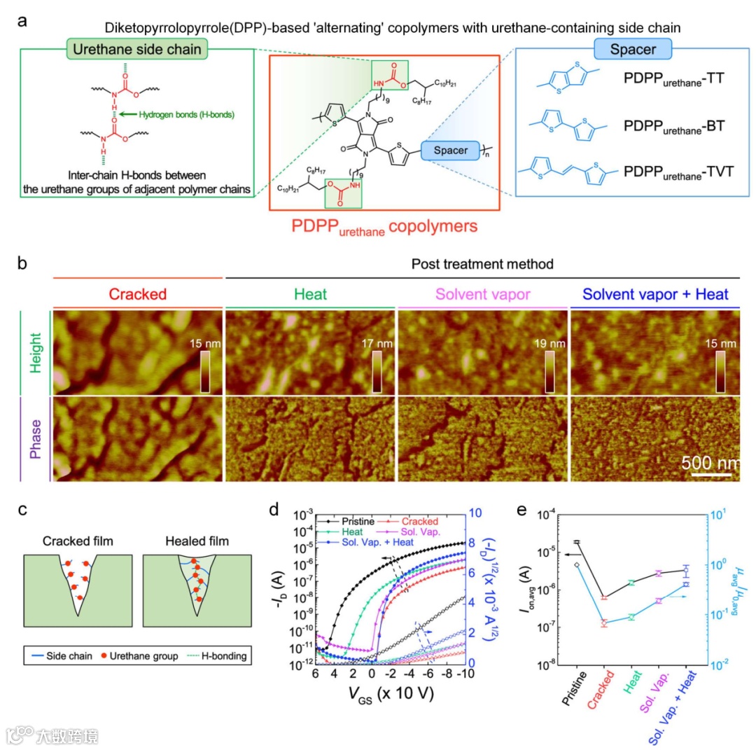 第三,作者介绍了用于电子设备的自修复聚合物,分别从可拉伸导体、场效应晶体管、传感器和介电弹性体致动器四个部分展开。如:导电咪唑作为客体分子与葫芦脲主体络合得到可拉伸导体,分子链的缠结滑动和主客体相互作用的协同作用使水凝胶具有高韧性和自修复能力,内部移动离子构成渗滤导电路径;将PU长侧链引入吡咯并吡咯二酮(DPP)基半导电聚合物,氢键相互作用提供自修复能力,并使分子链表现出共轭结构规整性,有利于有机晶体管半导体材料载流子迁移率的提高(图3);基于导电聚合物的压阻效应、应变电容效应、对温度敏感等特性,设计自修复分子链结构,可制成自修复且灵敏度高的压力、温度和化学传感器。