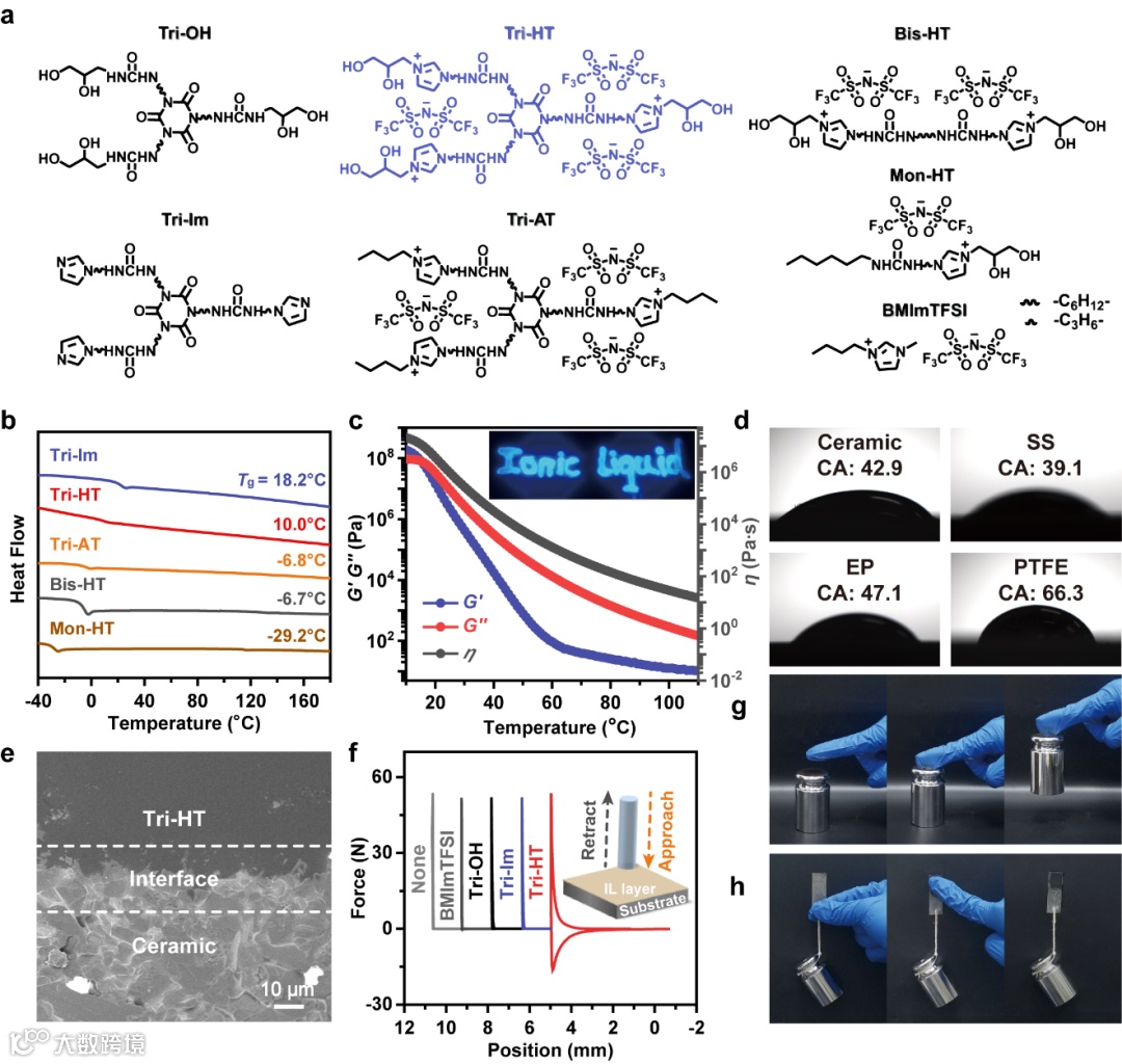 近期,湖南大学材料科学与工程学院张世国教授团队将离子液体(IL)片段嵌入具有大量强氢键相互作用的有机分子骨架中(图1),制备出了室温附近表现出极高粘接强度的基于离子液体的超分子聚合物粘附材料(图2)。离子液体基团的引入,不仅可以通过阴、阳离子间的静电相互作用提高材料本身的内聚强度,而且能有效抑制刚性和有序氢键网络的形成,释放更多能在界面处形成氢键的氢键供体/受体,提高界面粘附强度,从而实现小分子离子液体在各种基底表面的高强度粘附(图3)。并且,将其与碳纳米管结合可以进一步制备出具有一定导电性、自愈合行为和电控粘附性的复合型胶粘剂(图4)。