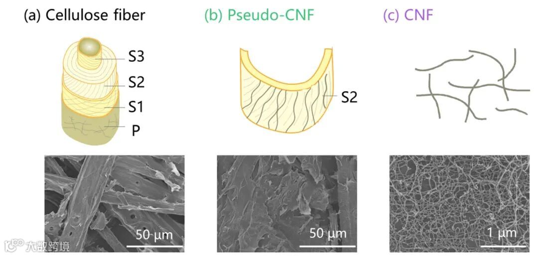 图2. 纤维素纤维、pseudo-CNF和CNF的结构示意图及对应的SEM图