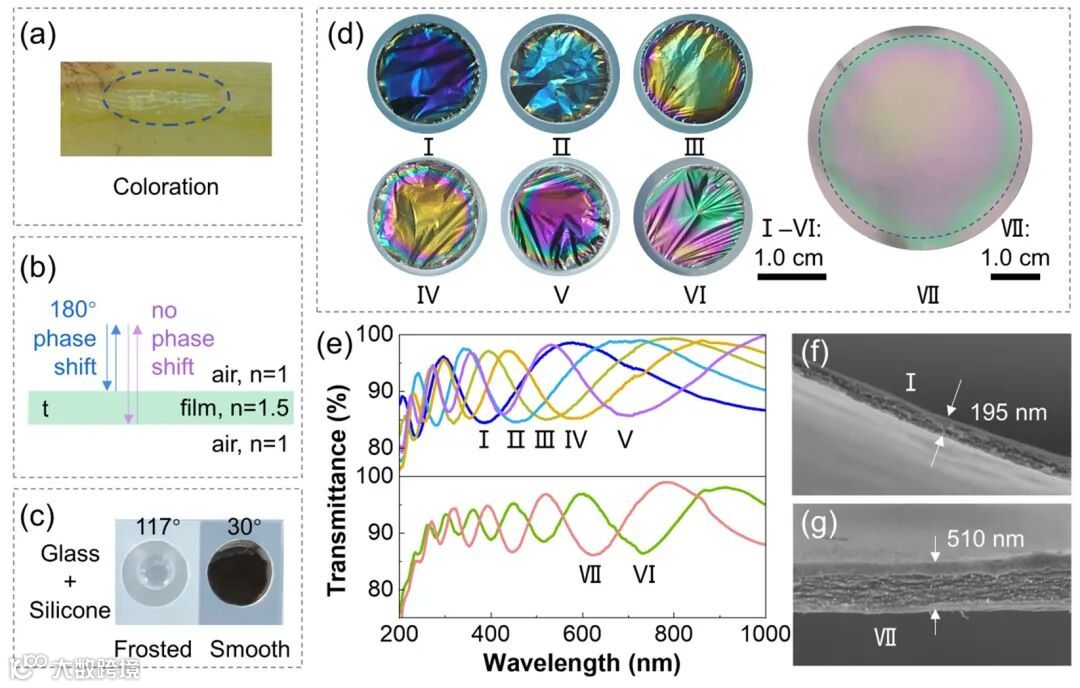 薄层状结构经过简单解纤可得到产物2纤维素纳米纤丝,其突破性应用是将阳离子化CNFs用于制备全色域的自支撑干涉膜(图4)。选择疏水的磨砂玻璃作为基底时,铸膜干燥后的膜容易揭下,膜呈现的颜色由厚度决定(图4d–g)。
