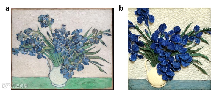 图6.(a)梵高与1890年创作的《花瓶中的鸢尾花》;(b)喷涂法绘制的《花瓶中的鸢尾花》光子画