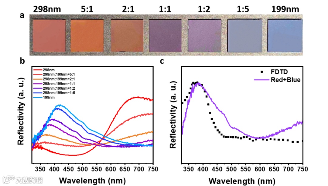 图4.由不同体积分数的298 nm和199 nm(298 nm: 199 nm=5: 1, 2: 1, 1: 1, 1: 2, 1: 5)PDA@SiO2 NPs制备的二元亚稳态光子颜料的(a)光学图像及(b)反射光谱;(c)实验测量(实线)及3D-FDTD计算(虚线)得到的二元亚稳态光子结构(298 nm: 199 nm=1: 1)的反射光谱
