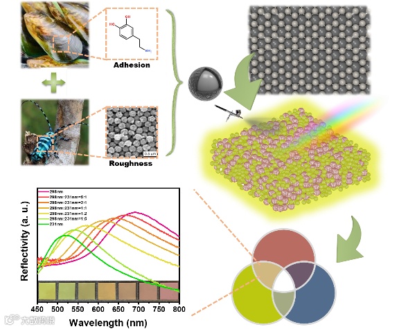 本文创新性地构建了二元亚稳态光子晶体,以获得可精确寻址的“真彩色"。以贻贝的超强粘附和长角天牛的光子鞘翅为灵感,通过调控驱动力与构筑单元表面粗糙度来协同调节热力学与动力学因素,成功构建了具有可调谐光子带隙的二元亚稳态光子晶体,建立了构筑单元体积分数和光子带隙之间的定量关系,并且巧妙地利用了亚稳态结构特有的紫外特性,再现了传统混色无法得到的真紫色(Violet),实现了符合加色混合的“真彩”调色板效应。此外,得益于这种光子颜料的独特性能,其稳定性和应用范围得到进一步扩展。这种新型的光子颜料不仅解决了现有色料都是混合色的本质窘境,而且实现了真彩色的可调性和多样性,有望为世界调色板提供了新的选择。
