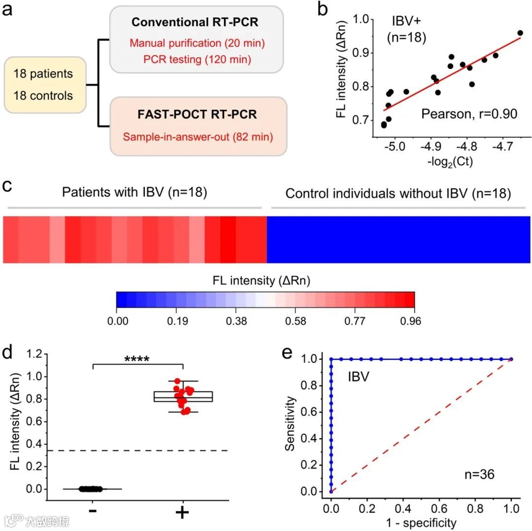 最后,他们利用FAST技术对36名志愿者进行了流感病毒的核酸检测,并与常规的手工核酸检测方法进行了对比。检测结果表明,FAST技术对临床样本的检测结果与常规方法相当(Pearson, r = 0.90), 并且FAST技术仅需82分钟即可得到检测结果,整个检测过程无需人工干预,而传统方法需要140分钟,且需要手工完成加样、混合、样本转移等操作(图4)。