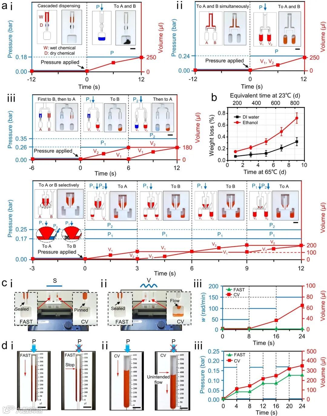 (1)微流体串行、并行、顺序及选择性流动状态任意切换(图2a);流动快速、精确响应(图2d);抵抗环境振动干扰,在150 rad/min的振动下仍然不发生泄露(图2c)。