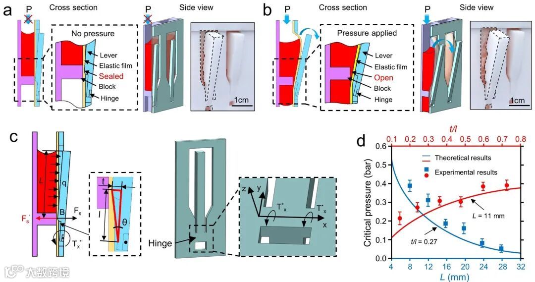 该微流体操控方法基于简单的杠杆原理:在不通气压时,杠杆通过弹性薄膜压紧挡块,将液体密封(图1a);通入临界气压后,薄膜膨胀将杠杆推开,挡块与薄膜之间形成空隙,微流体可以通过空隙流入后面腔体(图1b);撤掉气压后杠杆利用连接铰链的弹性自动复位,重新将液体密封。通过调节杠杆的长度及杠杆支点位置等参数,可以方便地对微流体流动临界压力进行调节(图1c,d)。
