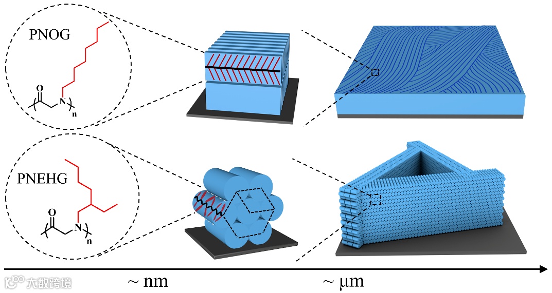 高分子链可通过结晶形成跨尺度、多层次的有序结构和组装形貌,对材料的各项物理化学性质和性能起着决定性作用。通过化学结构设计调控聚合物的结晶行为,从而得到具有理想多级结构和性质性能的高分子材料,一直是该领域的研究热点。聚类肽,一类仿肽高分子材料,由于其可溶解可加工性、良好的生物相容性及抗蛋白酶水解性等特点,在生物医用领域有着潜在的应用价值。近年来的研究表明,通过在聚甘氨酸主链氮原子上引入长烷基侧链,可以使聚类肽在特定条件下形成结晶相或液晶相,从而获得种类繁多的纳米结构和组装形貌。然而,侧链结构如何影响聚类肽的分子排列和多级晶体结构,目前仍缺乏系统研究。