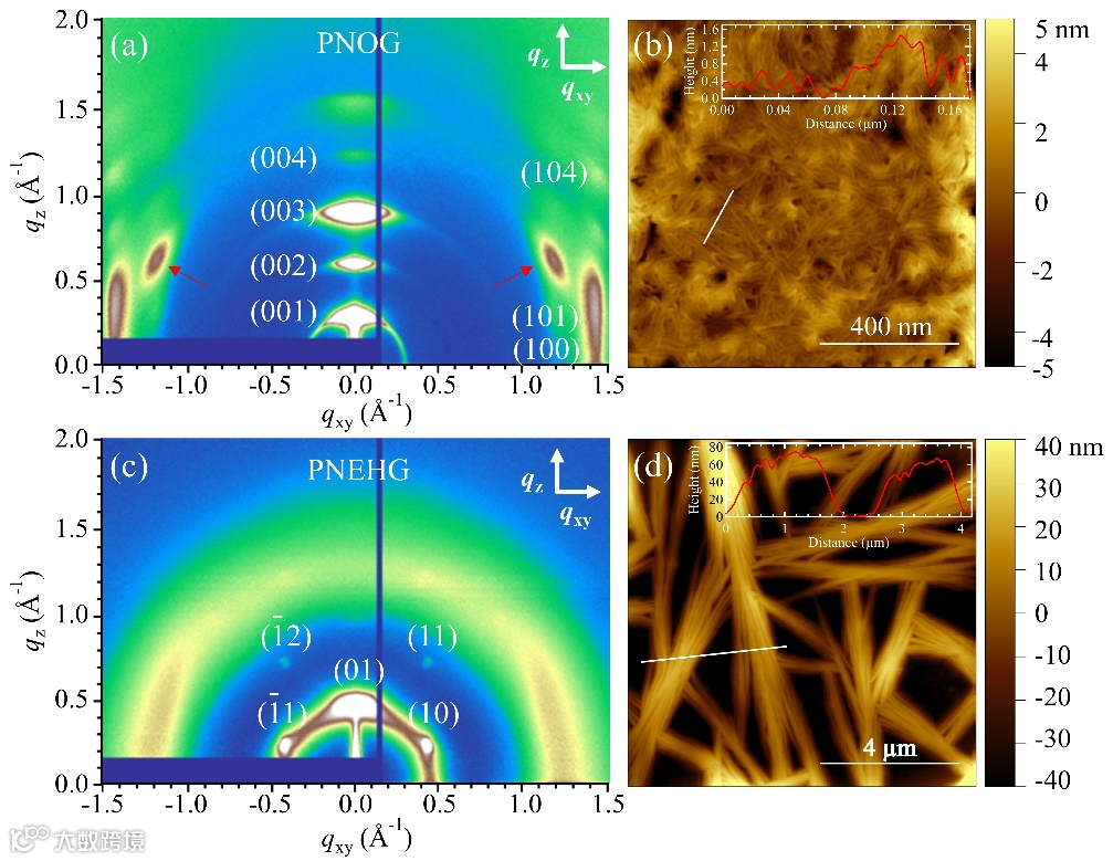 图1(a、b)PNOG薄膜的GIWAXD与AFM结果。(c、d)PNEHG薄膜的GIWAXD与AFM结果。