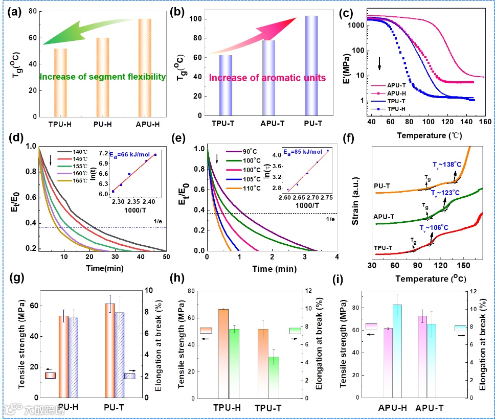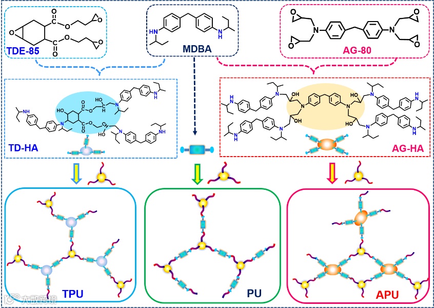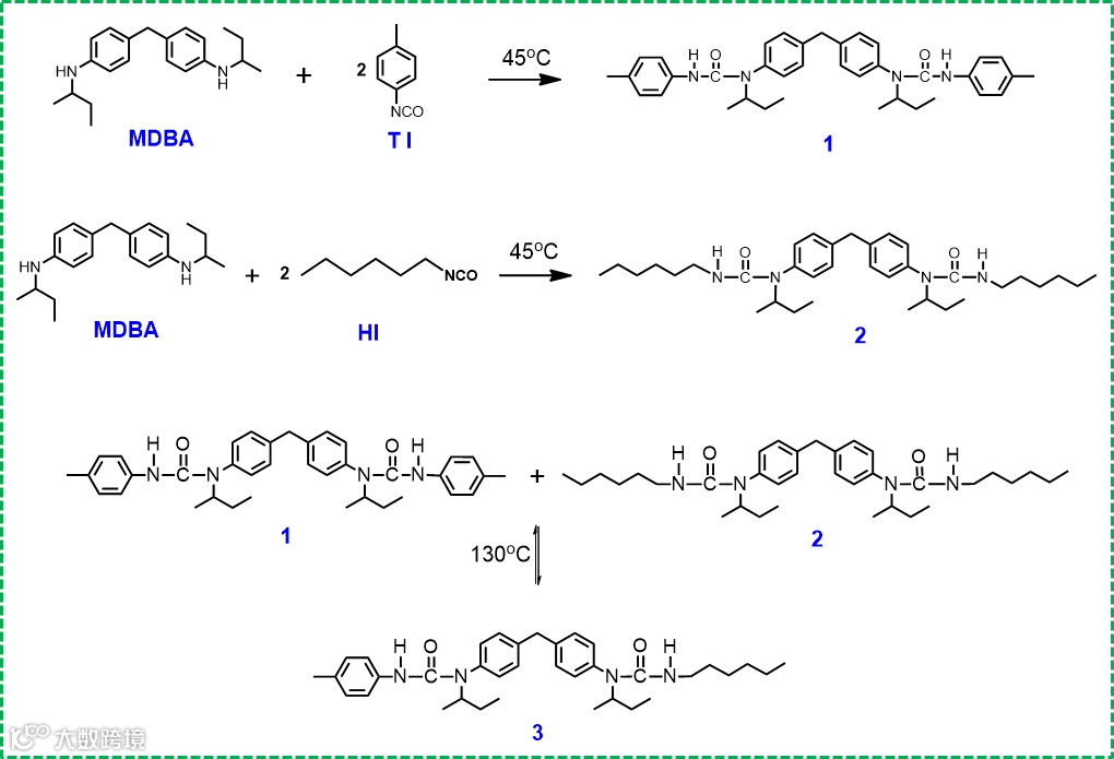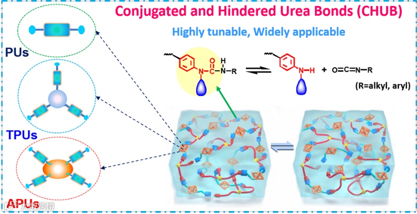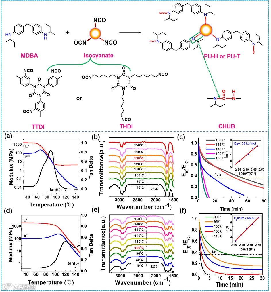 基于动态共价键的可适性交联网络可以赋予交联高分子可再加工、可愈合和可再生等宝贵性能,但是,动态共价键的不稳定性又不可避免地牺牲高分子材料的热稳定性和机械性能。因此,开发具有优异的热性能和机械性能的的动态交联高分子具有重要的学术价值和应用前景。近期,西安交通大学化学学院功能高分子研究组(RGFP)报道了一类具有共轭和位阻双重效应的动态脲键(CHUB),该种动态脲键采用烟台万华工业化生产的4,4’-二仲丁氨基二苯甲烷(MDBA)与芳香族异氰酸酯反应形成(图1)。与仅基于位阻效应的动态脲键相比,虽然具有较低键能的CHUB容易解离,但是,更多的芳香性分子骨架却赋予这种动态共价交联网络相当高的稳定性,从而使材料表现出较高的玻璃化转变温度、较高的力学性能以及高温下较快的应力松弛(图2)。