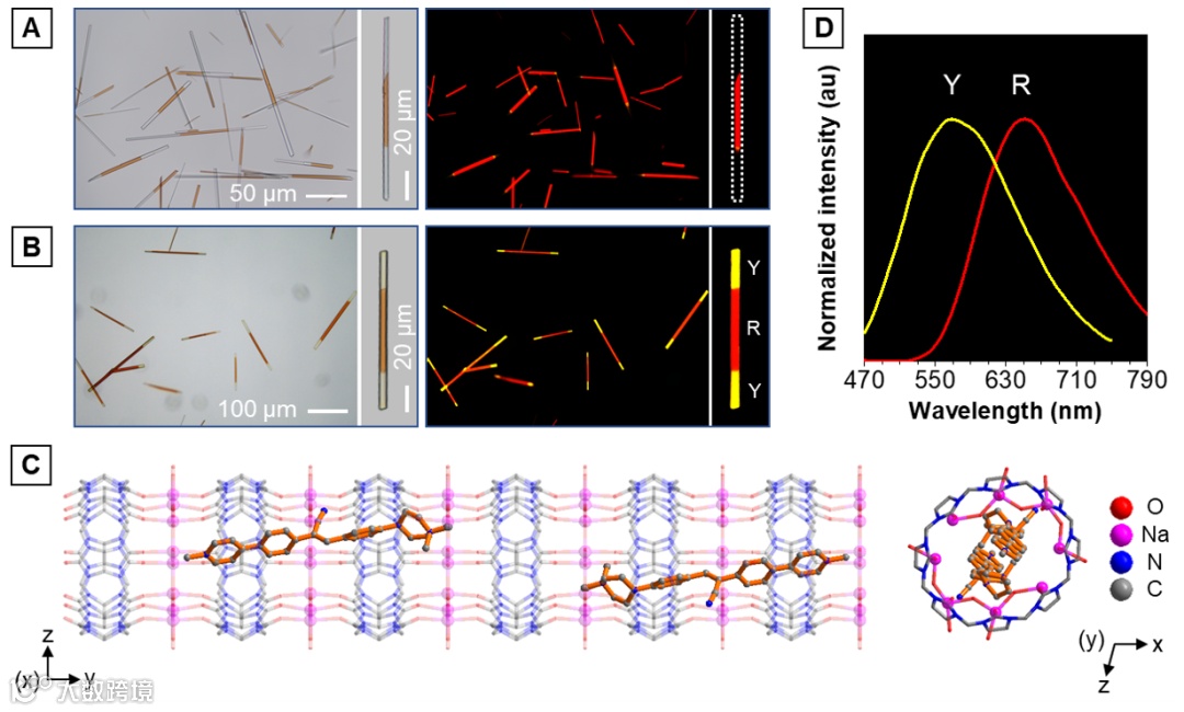 该研究通过溶液挥发的方法制备了两种荧光三嵌段微棒(图2)。在高湿度缓慢挥发条件下,R末端形成了无荧光N段(N-R-N);而在中等湿度稍快挥发的条件下,R末端形成了黄色荧光的Y段(Y-R-Y)。Y的单晶结构证明CSPP分子以单体形式分布在CB[8]-Na+纳米通道中。Y段和R段的最大荧光发射波长分别为570 nm和650 nm。前线分子轨道和势能面分析解释了两者的荧光发射区别。利用荧光光谱,紫外可见吸收光谱,荧光寿命以及荧光成像分析了多级超分子自组装的机理。在溶液挥发的过程中,NaBr被浓缩。由于金属阳离子可以与有机客体竞争结合葫芦脲的端口,因此高浓度Na+会破坏CSPP与CB[8]的络合。但是CSPP dimer@CB[8]结合非常强,高浓度NaBr(甚至到5 M)只能部分解离CSPP dimer@CB[8]-NaBr 超分子聚合物,形成少量CSPP assembly。而CSPP monomer@CB[8]结合非常弱,在高浓度NaBr溶液中非常不稳定。只有当CB[8]浓度达到饱和时,CSPP monomer@CB[8]-NaBr 超分子聚合物才会被驱动形成并结晶成Y嵌段。CSPP assembly正好作为CSPP的储存库,在条件成熟时释放出CSPP用于制备Y嵌段。