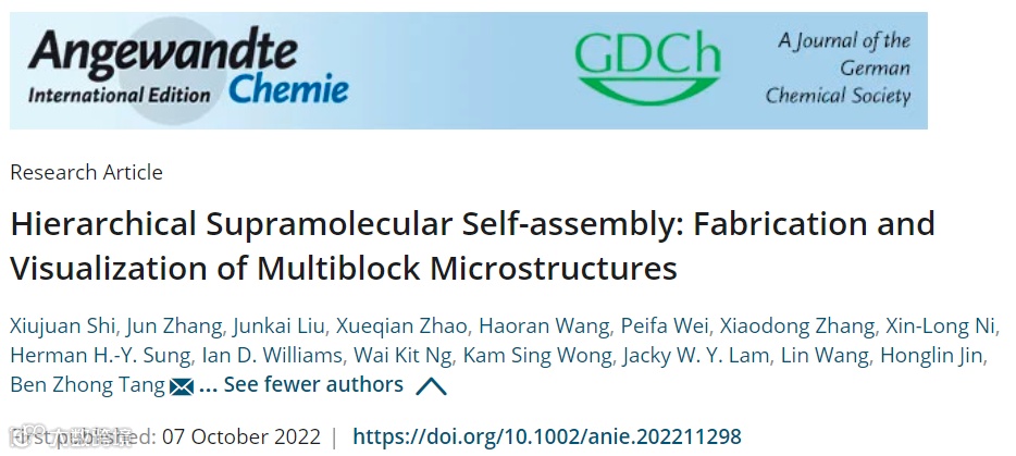 近日,香港中文大学(深圳)唐本忠院士、华中农业大学生物医学与健康学院金红林教授和华中科技大学同济医学院附属协和医院王琳教授合作发展了多级超分子自组装,利用CB[8]与不同数量AIEgen客体(2,1,0)的络合作用,以及CB[8]与Na+和Br-的弱相互作用,实现了一锅法制备1到7段荧光多嵌段微棒。相关工作以“Hierarchical Supramolecular Self-assembly: Fabrication and Visualization of Multiblock Microstructures”为题发表在Angew。
