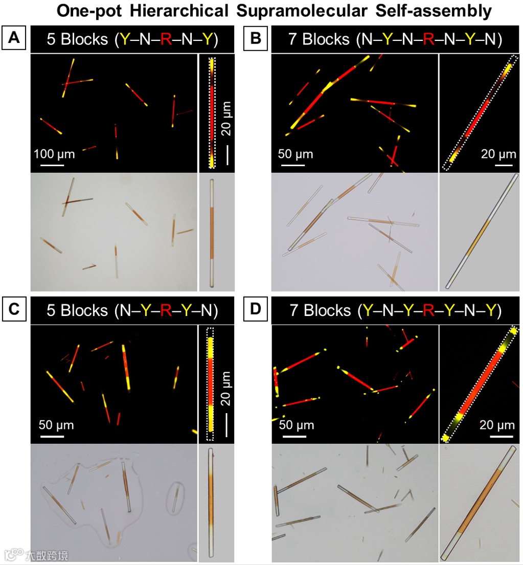 图3:一锅法多级超分子自组装制备荧光5嵌段和7嵌段微棒