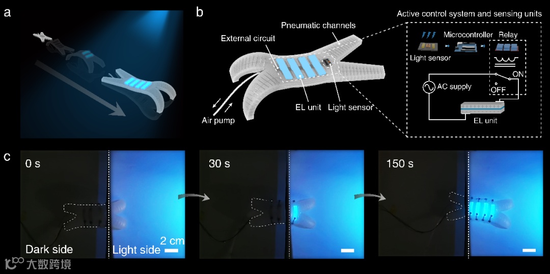 该团队从自然界变色龙中获得灵感,通过3D打印技术将柔性发光单元以及光传感单元集成在软体机器人上,构建人工智能伪装系统(图3)。集成的光传感器可实时接收外部环境光信号,通过逻辑电路信号处理将环境光信号转换为电信号控制软体机器人不同部位的发光单元显示,从而实现机器人行走过程中自主感知环境变化并迅速响应做出伪装反馈。