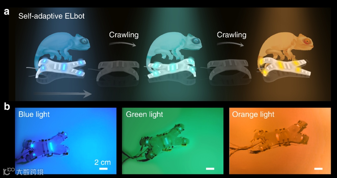 此外,通过设计多彩发光单元及相应的逻辑回路,可实现彩色实时伪装。为了实现此设计,该团队首先尝试打印多彩像素矩阵,通过光传感单元感知环境光色彩变化,可实时控制矩阵单一色彩显示。如图4所示,当机器人爬行到不同颜色环境光区域,发光单元被选择性点亮以匹配环境光变化,这种能力与自然界的变色龙十分相似。