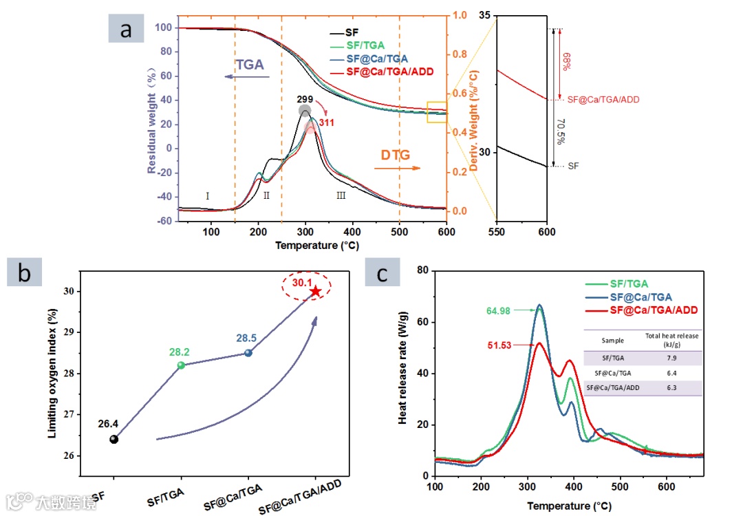 图7. SF@Ca/TGA/ADD 胶黏剂(a)TGA 和 DTG 曲线;(b)LOI 值;(c)HRR 和 THR 曲线