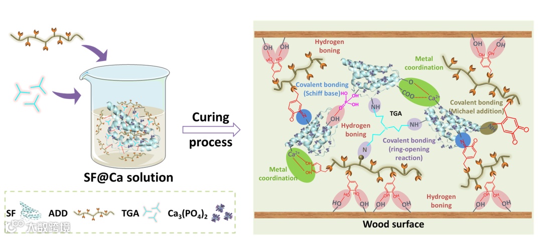 图3. SF@Ca/TGA/ADD 胶黏剂的制备及反应机理图