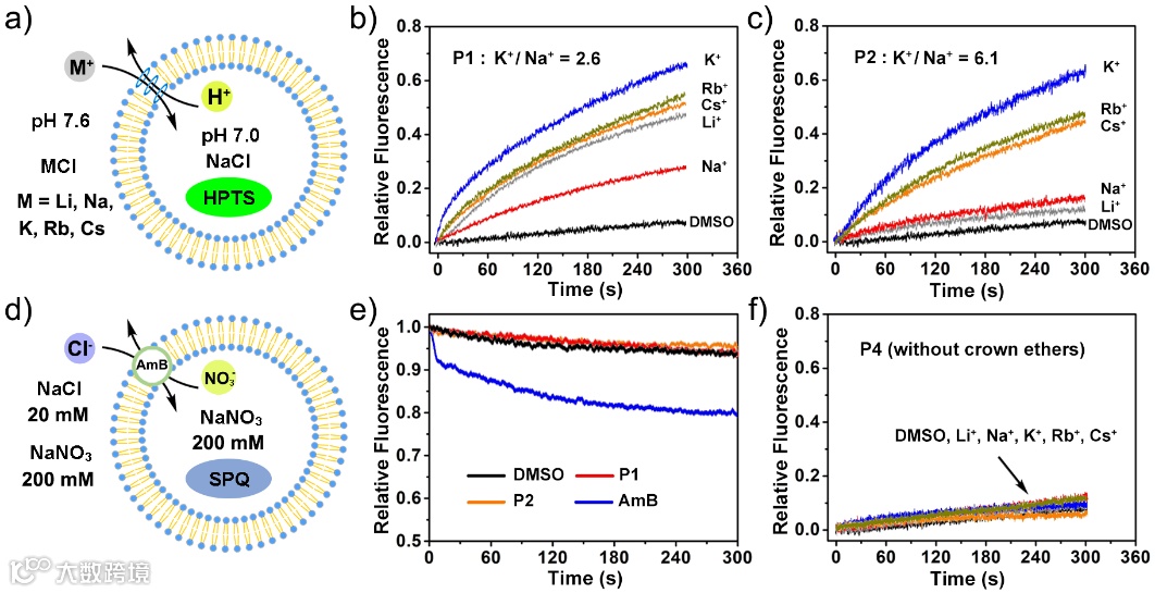 杭州师范大学刘俊秋教授团队采用简单的“一锅法”聚合反应,制备了一系列侧链含有苯并18-冠醚-6基团的柔性聚合物并对其离子跨膜传输性质进行了详细研究(图1)。研究发现,在一定的单体比例条件下,柔性聚合物上的冠醚基团可以对钾离子进行选择性跨膜传输。由于胆固醇具有十分优异的嵌膜能力,因此,当在聚合物当中引入少量胆固醇作为“锚定”基团,可以使聚合物的嵌膜稳定性大大增加,并且通道的K+/Na+传输的选择性也得到了明显增强(图2)。平面脂双层单通道电流实验表明,不含胆固醇基团的聚合物P1在磷脂膜上并没有形成稳定孔道结构,而是以载体形式进行离子跨膜传递。而含有胆固醇作为“锚定”基团的聚合物P2在可以明显观测到平稳的方波型电流信号,因此可以判断苯并18-冠醚-6基团能够在P2上排列形成规则纳米孔并进行离子传输。