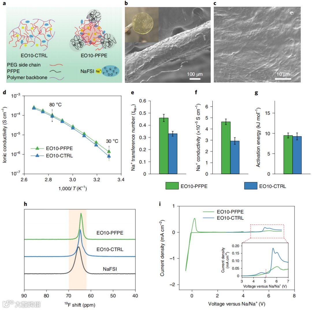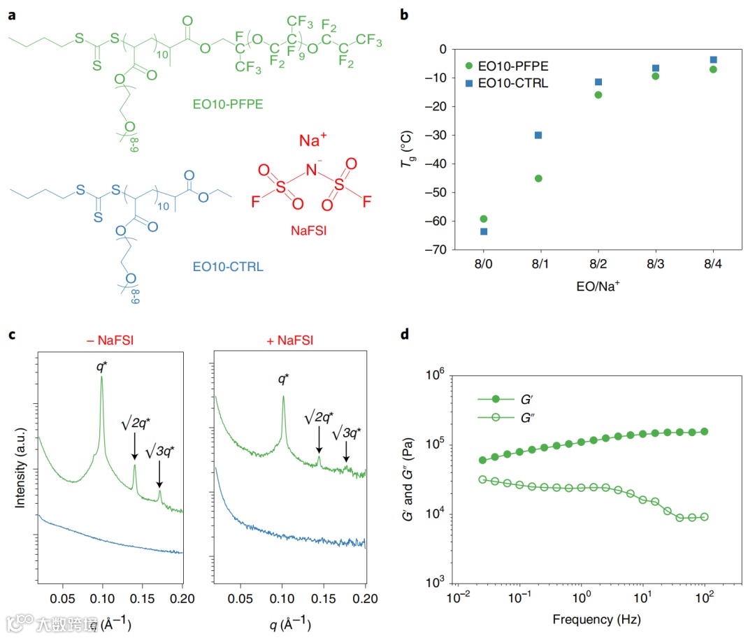 在此,澳大利亚迪肯大学Maria Forsyth教授和澳大利亚昆士兰大学Andrew K. Whittaker教授等人设计并开发了一种基于全氟聚醚端接聚氧化物(PEO)基嵌段共聚物的无溶剂固态聚合物电解质(SPEs),用于安全稳定的全固态金属钠电池。与传统的PEO SPEs相比,嵌段共聚物设计具有自组装纳米结构,在高温下能够产生高存储模量,即使在高盐浓度(EO/钠=8/2)下,PEO也能提供运输通道。