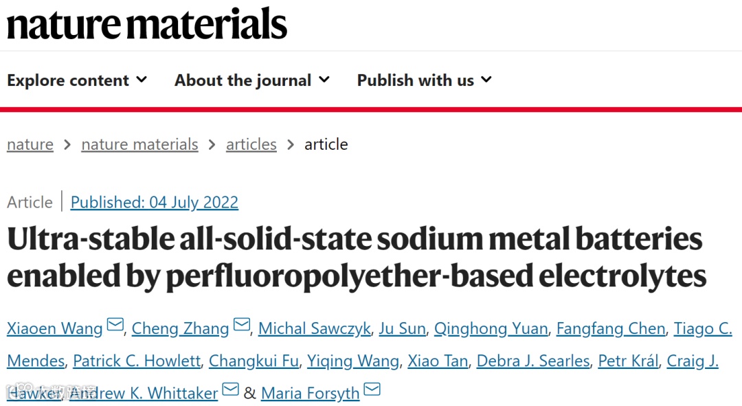 3. Wang, X., Zhang, C., Sawczyk, M. et al. Ultra-stable all-solid-state sodium metal batteries enabled by perfluoropolyether-based electrolytes. Nat. Mater. (2022).