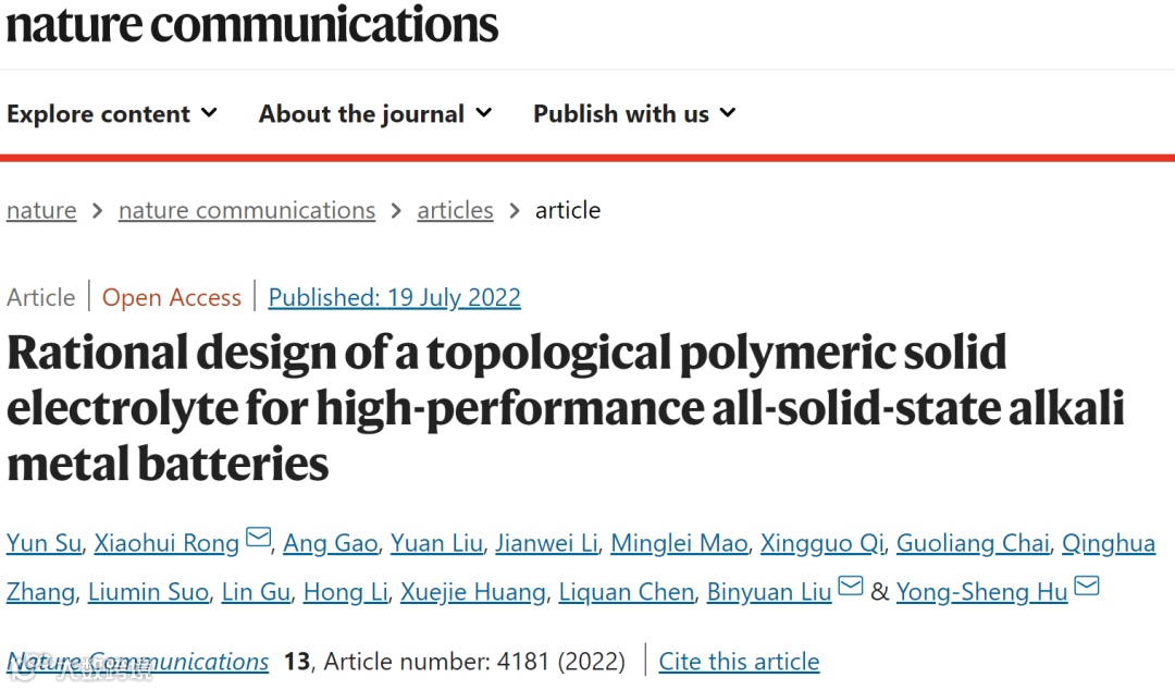 2. Su, Y., Rong, X., Gao, A. et al. Rational design of a topological polymeric solid electrolyte for high-performance all-solid-state alkali metal batteries. Nat Commun 13, 4181 (2022).