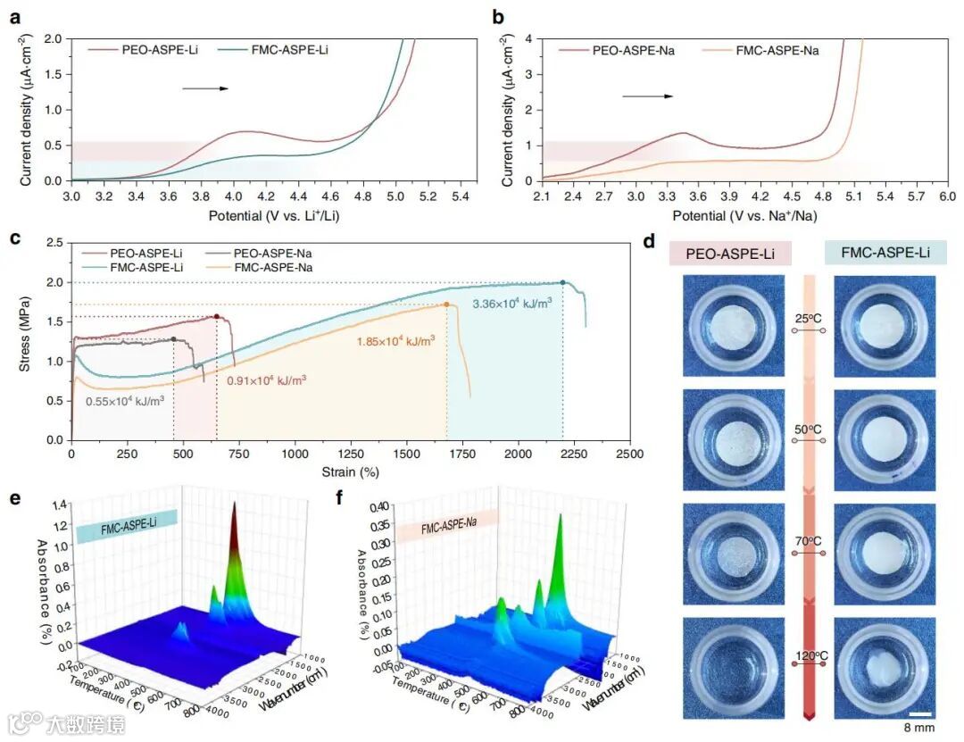 图2:富氟大分子和PEO基聚合物电解质的电化学和热稳定性测试