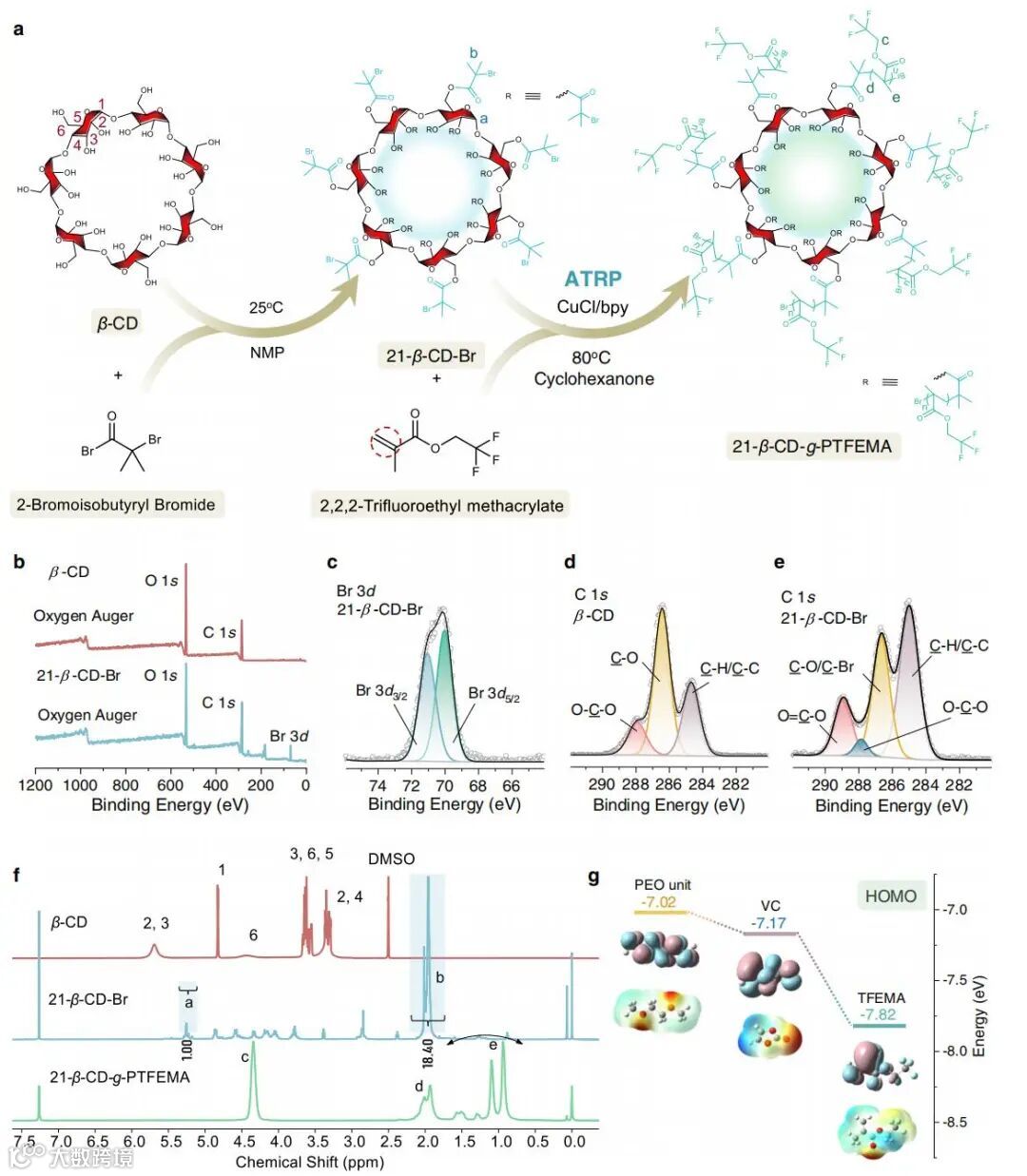 图1:21-β-CD-g-PTFEMA的合成路线以及相应的物理化学和理论表征