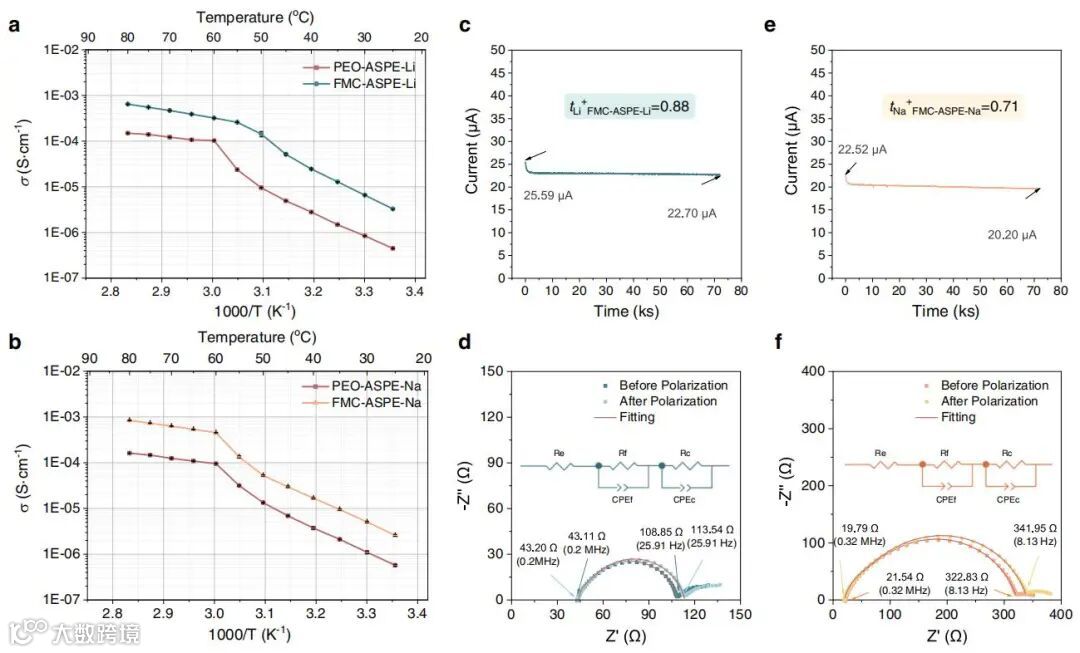 图3:FMC-ASPE-Li/Na和PEO-ASPE-Li/Na膜的离子传导特性测试