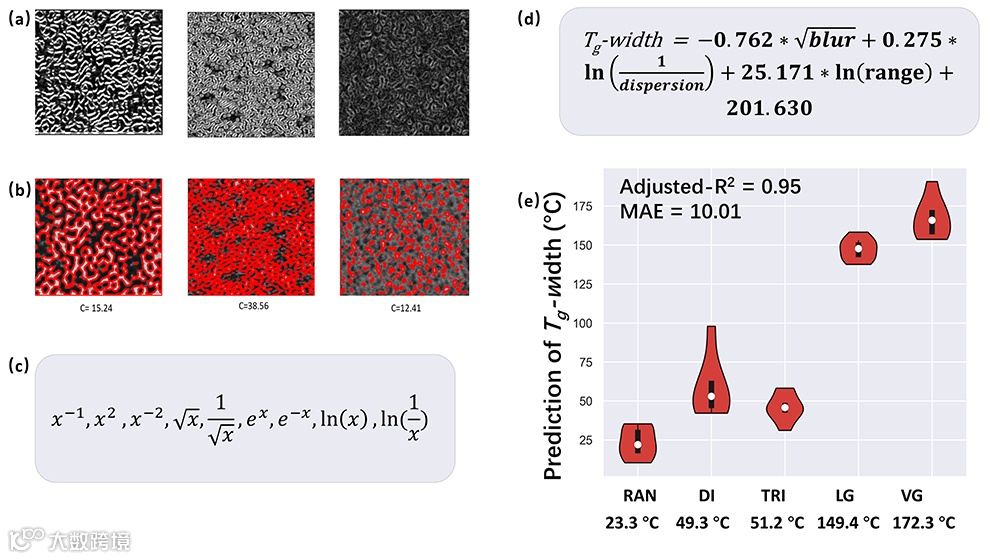 根据神经网络所提取的特征,通过边缘梯度提取定义模糊度,通过将全部轮廓周长加和定义分散度,通过像素极差定义对比度,将提取特征进行9种非线性变化,进行线性回归后可以获得图像识别的定量方程。通过该方程即可定量化计算图像结构对应的玻璃化温度宽度。通过对方程进一步分析,可以发现一些相关关系与我们的先验知识相悖,例如模糊程度与玻璃化温度宽度呈现负相关关系。产生这种现象的原因是因为无规共聚物的存在,其最大的模糊程度却对应了最低的玻璃化温度宽度,最终导致了这种现象。这进一步证明了定量化识别图像结构的意义,当多种不同规律甚至相反规律耦合之后,只有进行了量化定义,才会获得最终的图像结构与宏观性质的变化规律(图5)。