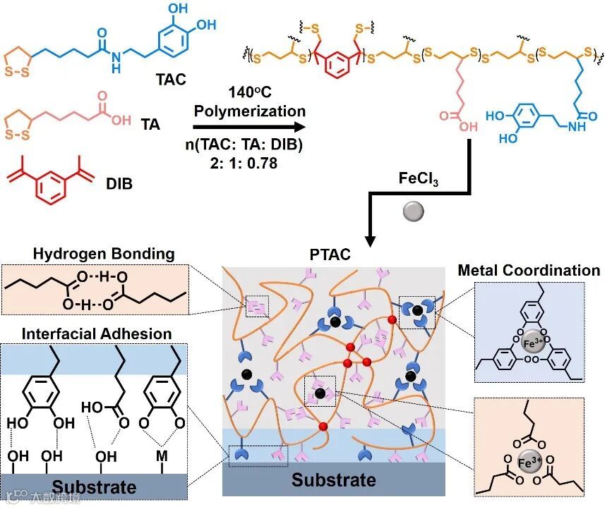 为将这两种粘合化学结合,研究者首先通过邻苯二酚修饰TA侧链以获得TAC单体,再进一步利用一锅法无溶剂开环聚合,成功制备出TA/TAC共聚网络,赋予材料高粘附强度、耐水性和动态性。