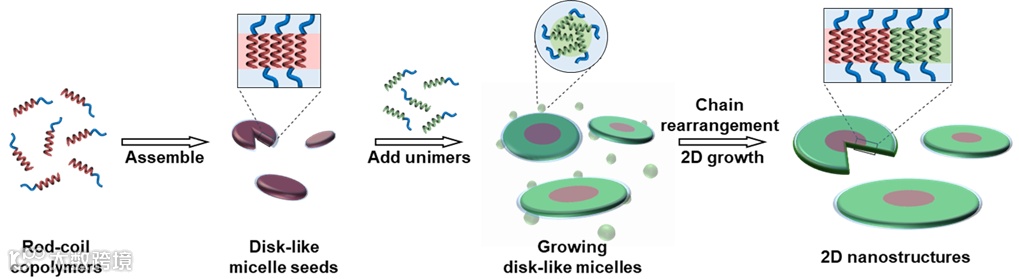 图1. 聚肽盘状胶束的可控融合生长过程及同心圆盘状结构