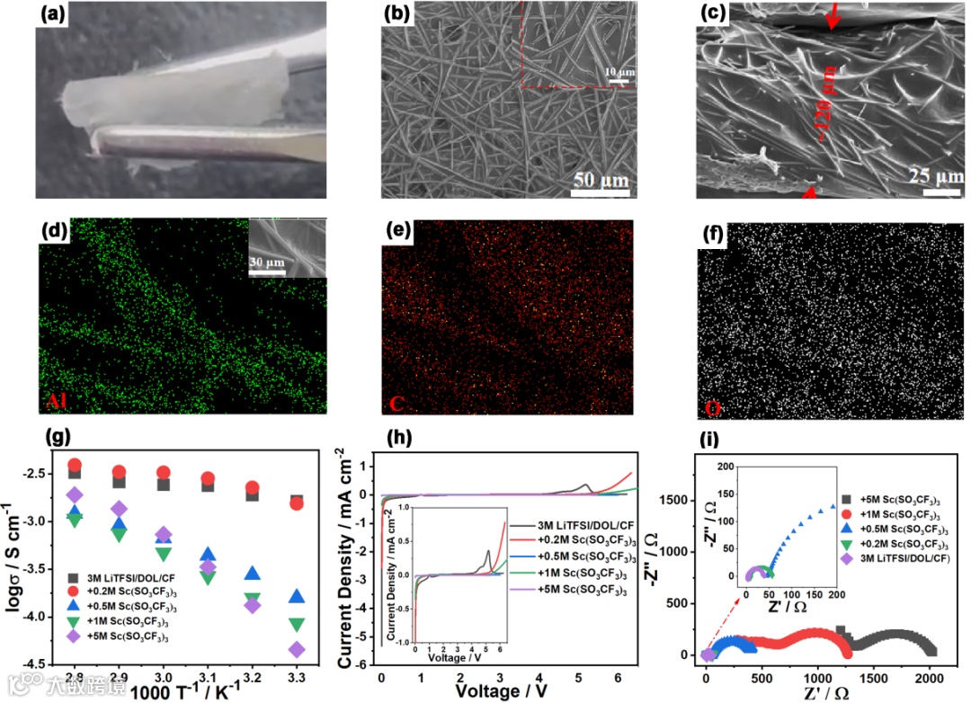 图2a显示了用1mM Sc(SO3CF3)3为引发剂制备的Poly-DOL/陶瓷复合全固态电解质的照片(以下简称CSE),它可以自立,具有良好的柔韧性。薄膜的表面和界面微形态分别如图2b和图2c所示,可以看出聚合物电解质均匀地沉积在陶瓷纳米线的表面和界面上,从截面上看,薄膜厚度为~120μm。CSE的Al(图2d)、C(图2e)和O(图2f)的能谱图进一步表明聚合物电解质和陶瓷纳米线的均匀混合。