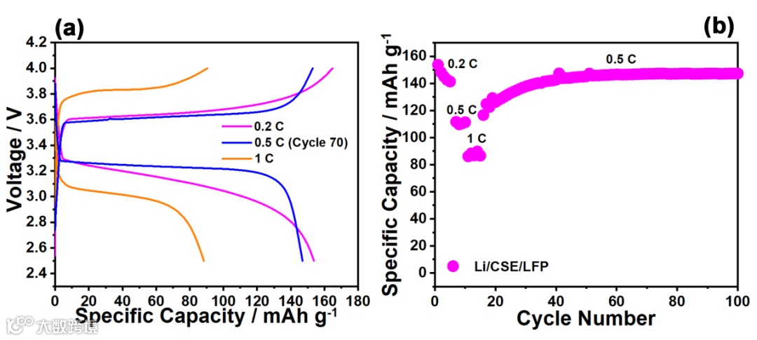 作者进一步组装了固态Li/LFP电池,该电池在0.2时的放电容量为154mAh g-1(第一次放电),库仑效率为93%;在0.5时的放电容量为147 mAh g-1(第70个循环),库仑效率为96%;在1C时的放电容量为88 mAh g-1(第12个循环),库仑效率为98%。图4b中显示了该电池100次循环的相应循环性能。在0.2、0.5和1 C的电流密度下循环后,再回到0.5 C,比容量慢慢增加到147 mAh g-1的稳定值,证明了使用CSE的LMB具有优越的速率特性和循环性能。