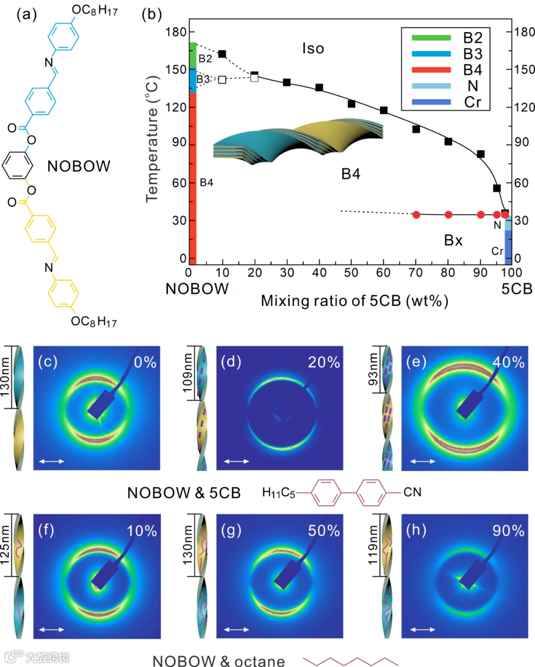 针对上述科学问题,西安交通大学材料学院、物理学院与美国劳伦斯伯克利国家实验室研究人员合作,利用共振软X射线散射(RSoXS)研究了这一结构在非手性小分子(5CB与正辛烷)掺杂条件下的自组装行为,从分子层面解析了结构中的分子排布模式以及螺距调控机理。