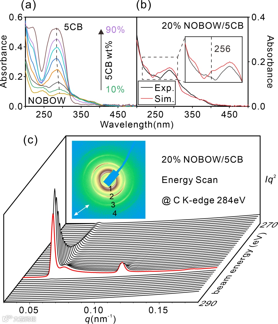针对肩峰,如图4所示,在不同元素吸收边附近测试可以发现,该肩峰在氧元素吸收边附近信号强度降低,意味着不含氧元素的5CB对肩峰有贡献。这是首次利用实验的方式证明即使在各向同性状态下,5CB会受到螺旋纳米线结构的导向,沿结构的凹陷方向排布成为近螺旋的手性超结构。