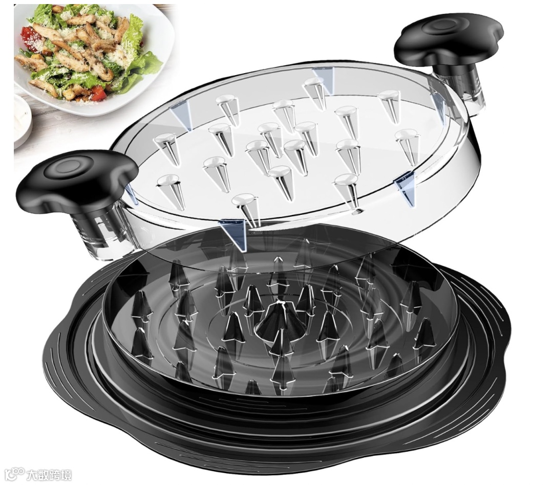 鸡肉切碎机采用升级结构设计,底部塑料齿全覆盖,搭配上盖辅助尖刺,夹紧食材均匀切碎,提升料理效率。防滑底座与人体工学把手操作省力。食品级材料不含BPA,耐热356℉,可机洗,附赠清洁刷。适用于鸡肉、猪肉、牛肉等熟食分丝,适合健身餐、烧烤、宠物喂食等场景。
