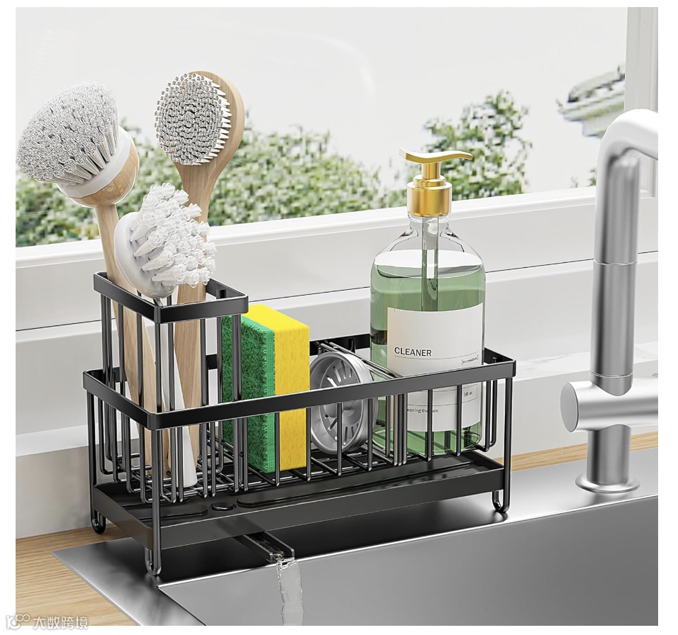 厨房水槽海绵架采用可旋转出水口设计,引导多余水分流入水槽,避免台面积水。体积小巧(9.25×3.97×6.37英寸),节省空间。配备三分区收纳结构,可存放洗涤剂、海绵球、水槽塞,并设4刷位支架,整洁实用。材质为优质不锈钢,防锈易清洁。