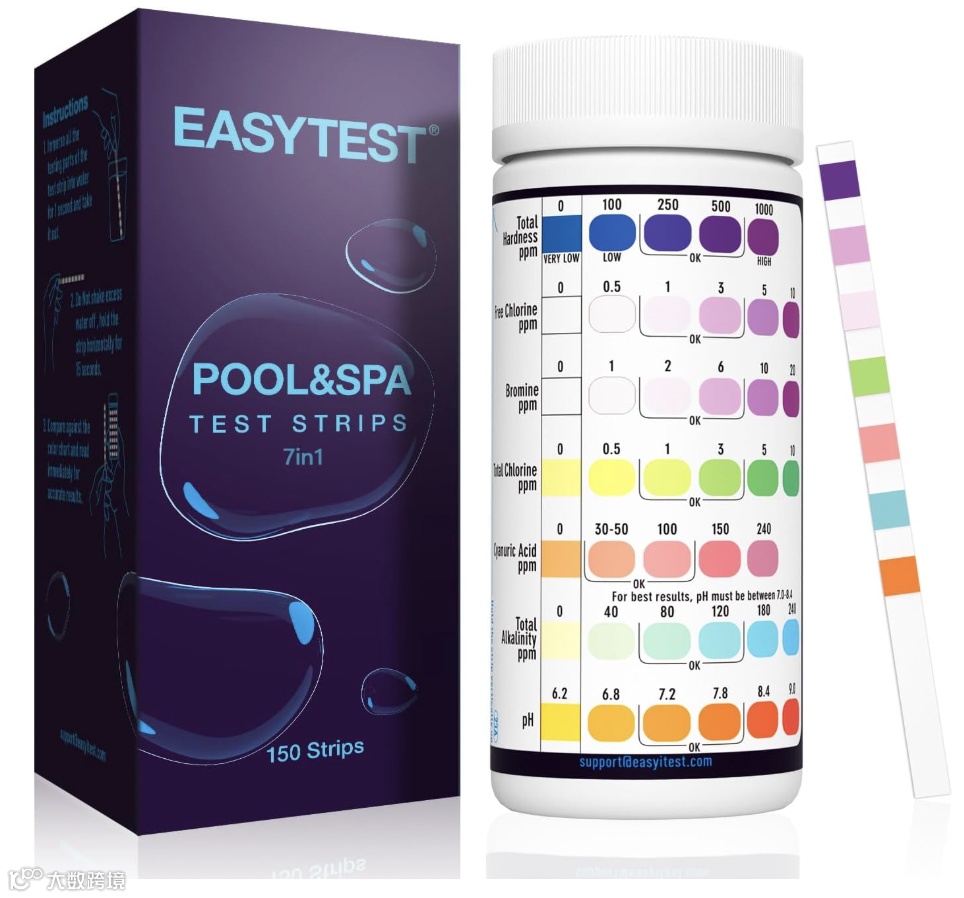 EASYTEST泳池水质测试条适用于泳池、热水浴缸及水疗设备检测。每条试纸1秒取样,15秒出结果,无需额外工具。可同时检测pH值、游离氯、总氯、溴、总碱度、总硬度、氰尿酸等7项关键指标,帮助用户及时掌握水质状况。