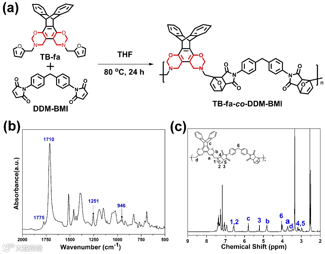 图2. (a)基于Diels-Alder反应合成主链型聚(苯并噁嗪-三蝶烯)共聚物;主链型苯并噁嗪共聚物的红外光谱图(b)与核磁氢谱图(c)。