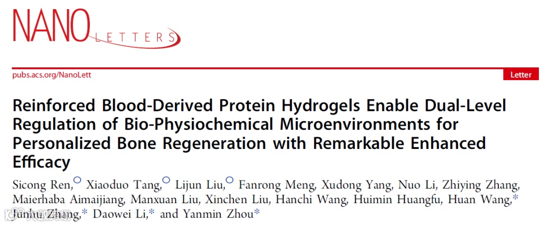 Reinforced Blood-Derived Protein Hydrogels Enable Dual-Level Regulation of Bio-Physiochemical Microenvironments for Personalized Bone Regeneration with Remarkable Enhanced Efficacy. Nano Lett. 2022, DOI: 10.1021/acs.nanolett.2c00057