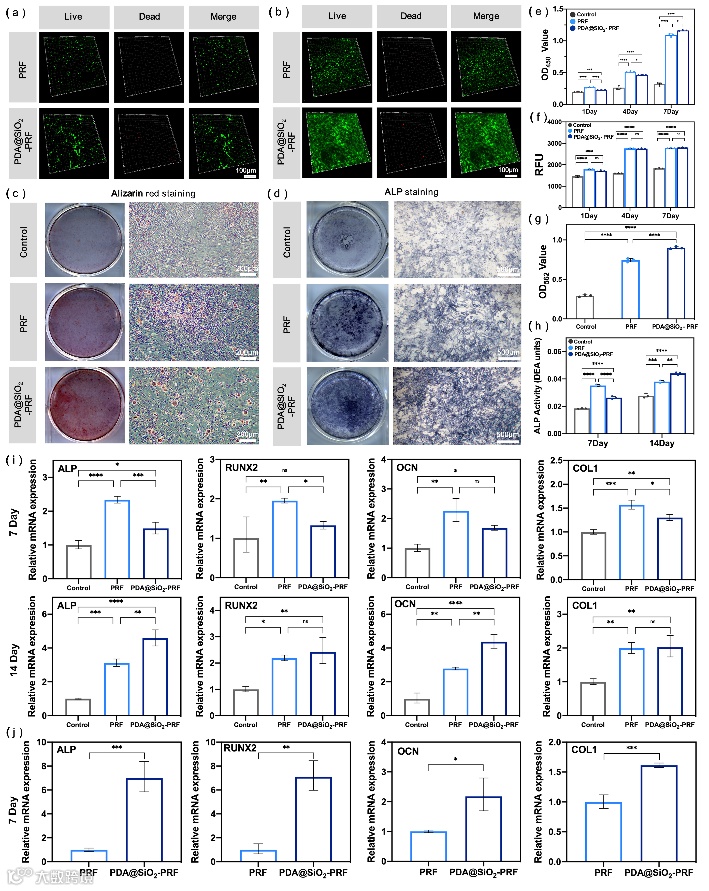 长期以来,细胞的物理微环境一直被认为是生长和发育的关键调节器。最近研究发现,基质的刚性已被证明对干细胞的命运具有决定性影响,而较硬的基质可以促进细胞的成骨分化,这就是刚性较低的PRF等材料对成骨细胞分化和骨再生的治疗效果不理想的原因。此外,骨再生的一个指导原则是使用机械屏障将骨缺损与周围软组织分离,并为骨细胞迁移创造足够的空间。此外,骨再生是损伤后的一个持续的过程。PRF对骨再生的不明确的影响也可能归因于PRF的快速降解和生长因子的快速释放。因此,目前迫切需要开发具有刚性高且可以持续释放生长因子的新型PRF蛋白水凝胶,用于高效的骨再生。