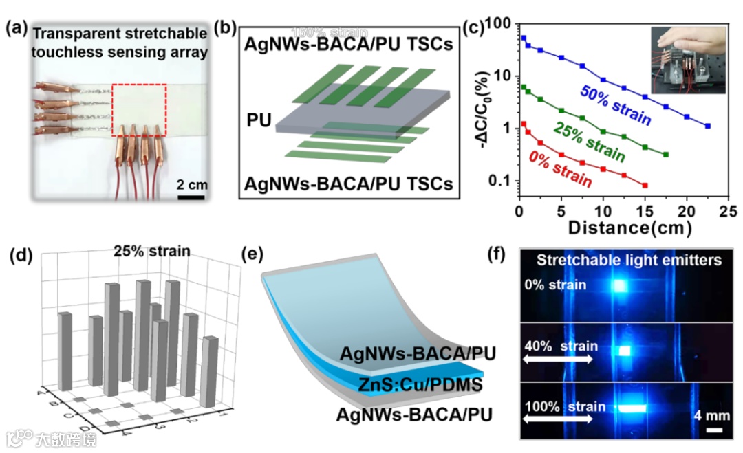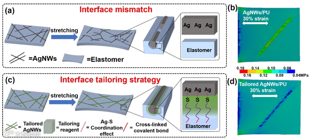 在透明可拉伸电子器件中,透明可拉伸电极有着至关重要的作用。银纳米线由于其优异的导电性和大长径比,适合用于制备透明可拉伸电极。但是由于刚性银纳米线与柔性基底的模量相差巨大,导致界面相容性差,限制其拉伸性和耐久性。