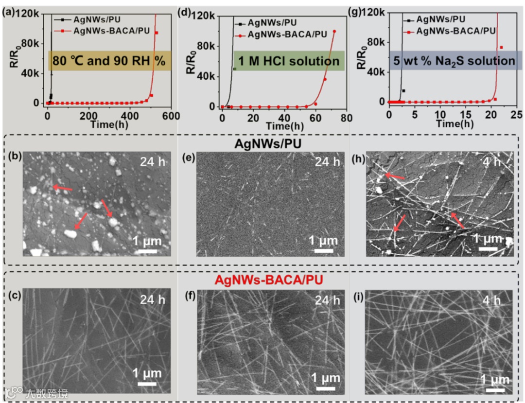 2. 使用含有巯基的化合物对银纳米线进行修饰,提高了银纳米线对环境的稳定性,以及银纳米线与聚合物的相容性,从而提升了透明可拉伸电极的性能。