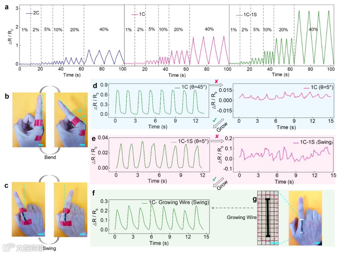 图2. 正交自生长策略调控PHEA-PANI水凝胶应变传感器的传感能力。(a)不同生长的传感器在相同拉伸应变下的不同电阻信号;(b)食指的弯曲运动;(c)食指的摇摆运动;(d)、(e)和(f)正交自生长策略改变传感器的传感能力以满足检测食指的不同运动场景。