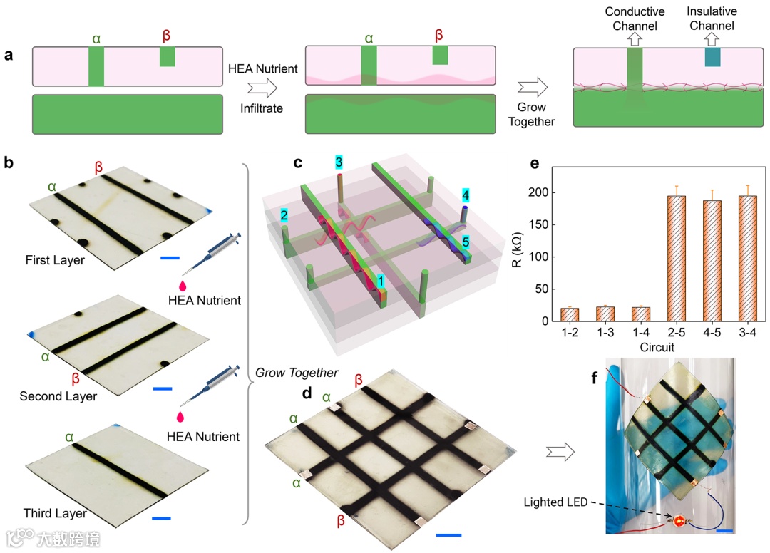 该正交自生长策略还可以构筑异质化的材料结构,目前通过印刷、3D打印、包埋等技术难以获得具有统一、无界面及复杂的三维导电水凝胶电路板。正交自生长策略可以实现限域构建导电通路,并结合生长自组装的方法制备3D柔性水凝胶电路板,如图3所示。首先,制备二维的电路板前驱体,后通过基底营养液的生长自组装过程构筑了3D水凝胶电路板。