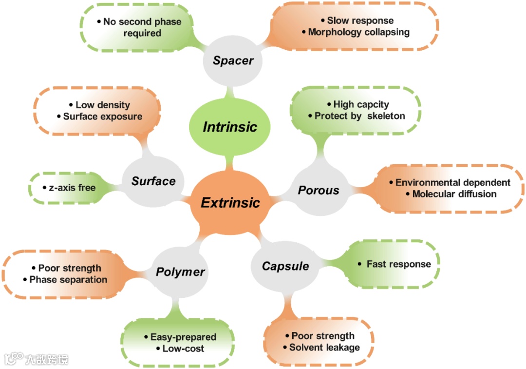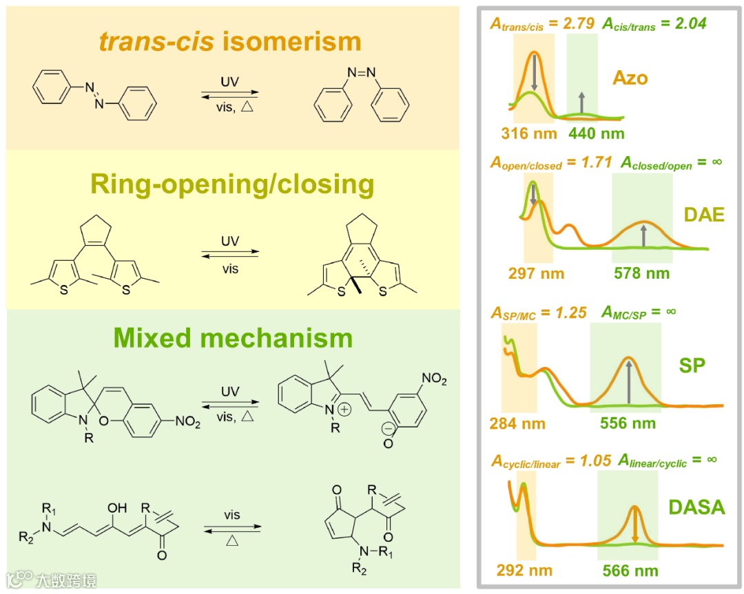 该论文通过分析光敏感分子(偶氮苯(Azo)、螺吡喃(SP)、二芳基乙烯(DAE)及给体-受体斯坦豪斯加合物(DASA))的结构及异构化机理 ,讨论了各类光敏感分子在固体状态下的异构化潜力(图2)。从限制光敏感分子在固体状态下的异构化机制出发,分析并讨论了提升光敏感分子在固体状态下的异构化性质的策略。