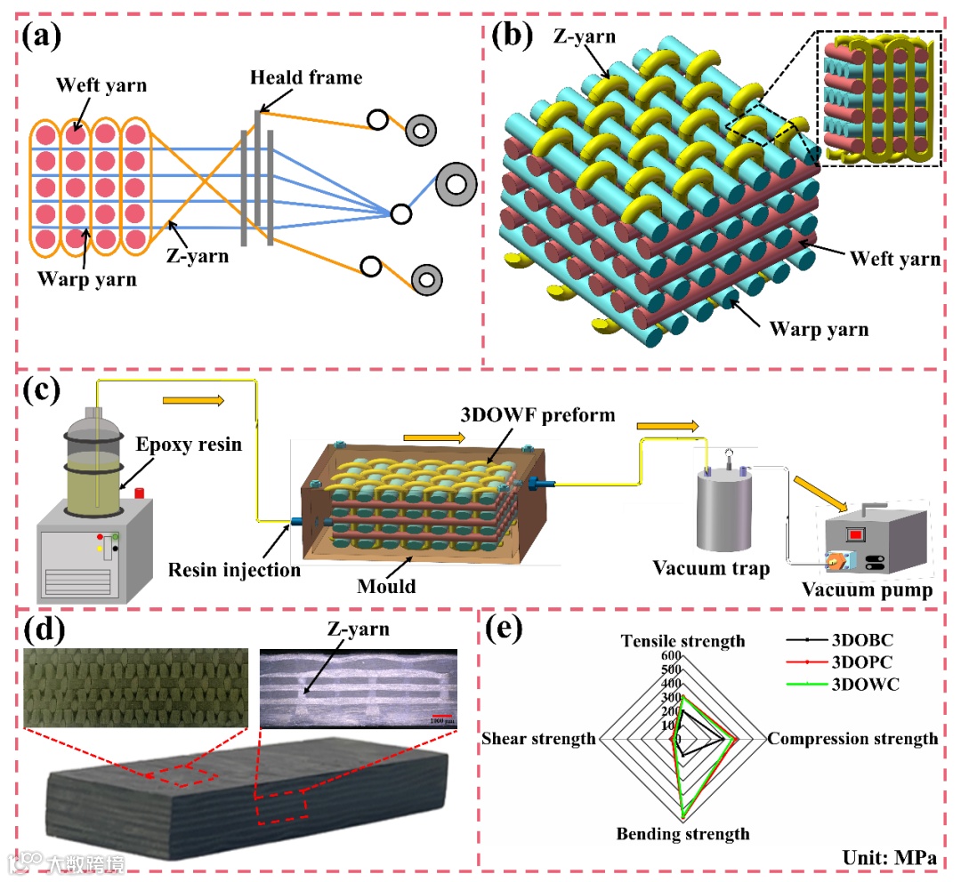 西安工程大学樊威教授团队制备了一种聚偏二氟乙烯压电纱线(PVDF压电纱线),用于先进3D纺织复合材料的实时损伤监测。如图1所示,通过静电纺在碳纤维表面包覆一层PVDF纳米纤维得到CF@PVDF纳米包覆纱,然后将碳纤维通过二维编织工艺编织在CF@PVDF纳米包覆纱上得到CF@PVDF@CF压电纱线。为了防止在后续固化过程中树脂过度浸入影响纱线的压电信号,通过共轭静电纺丝技术将聚氨酯(PU)包覆在CF@PVDF@CF压电纱上,最终得到PVDF压电纱线。随后,将PVDF压电纱线与碳纤维进行三向正交织物的织造,通过RTM固化工艺得到三向正交压电复合材料(3DOPC),如图2所示。