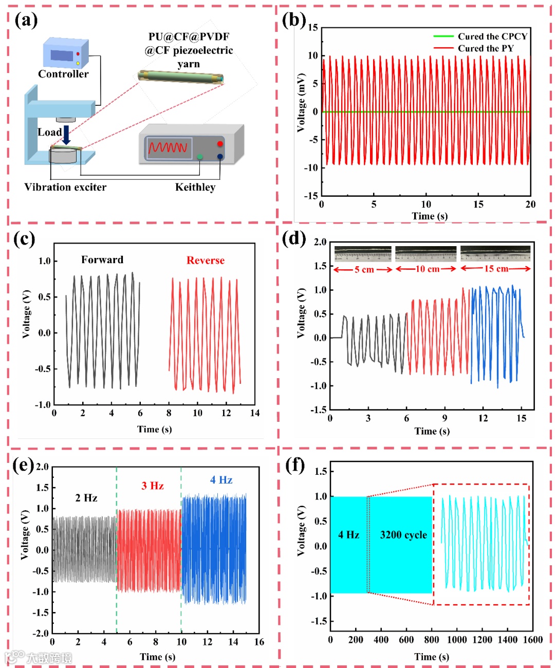 如图3所示,首先,对PVDF压电纱线进行了压电效应进行测试,以确定压电信号的产生来自于PVDF;其次,测试了不同长度和不同频率下压电纱线产生的压电信号,得出当压电纱线长度为15 cm和频率为4 Hz时,可以产生1 V左右的压电信号并且在高频率下可以稳定维持3200次压电输出。