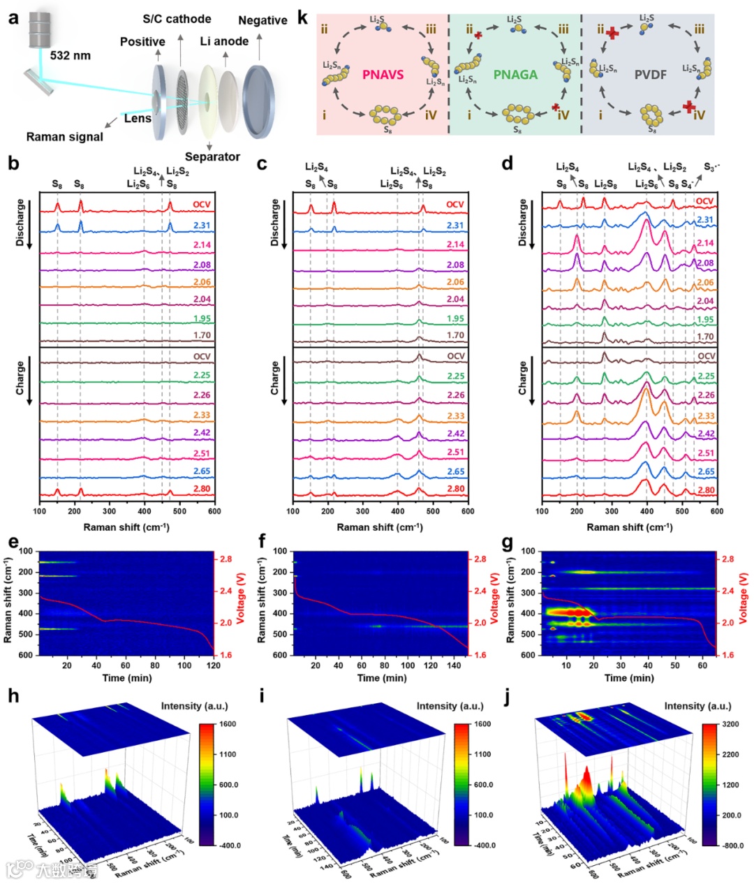 本研究通过原位拉曼光谱对锂硫电池的循环过程进行了表征。PNAVS粘结剂电池在放电初期表现出显著的S8特征峰。随着循环的进行,出现了可忽略的多硫化锂相关峰,并迅速基本消失。充电过程中上述过程发生逆转,最终S8特征峰均重新出现,表明LiPSs的氧化还原反应完全可逆。同时原位二维时间分辨和三维拉曼光谱显示在初始和最后阶段均只能观察到典型的高强度S8峰。弱LiPSs峰不明显并在循环过程中会逐渐消失,证实了PNAVS粘结剂具有出色的LiPSs吸附效果并可以促进LiPSs的氧化还原动力学。原位拉曼光谱表征结果为评估粘结剂抑制穿梭效应的能力提供了重要依据。